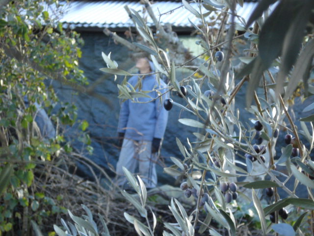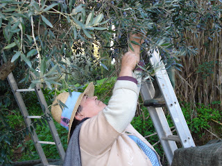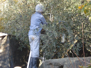em cima da escada ripando a azeitona com as mãos.